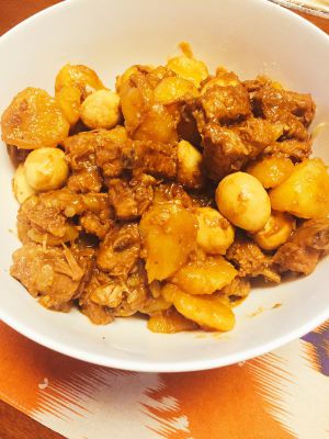 肉炖好以后,将肉和土豆在锅中煎蛋翻炒,然后加入肉汤,加入盐和生抽老抽,把鹌鹑蛋也加进去再继续炖煮。