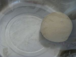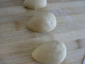分成三个48g左右的剂子,取其中一个揉圆后,用手大拇指和食指搓成圆润的水滴状