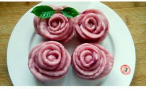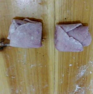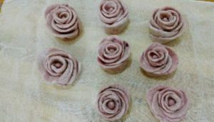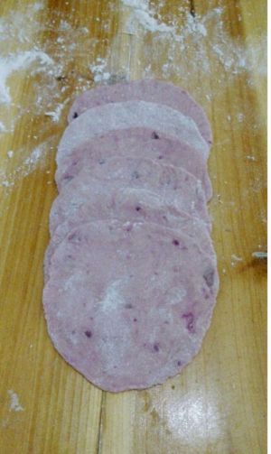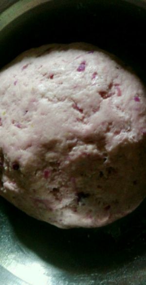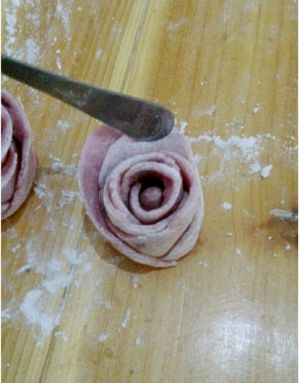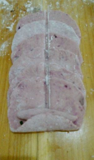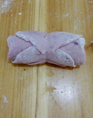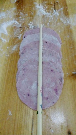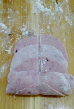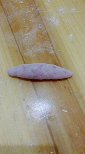 酵母用少量温水融化,加面粉中,揉成团,加入晾凉的紫薯泥,加入炼奶,揉成光滑面团,将面团发酵至2倍大,取出面团撒上干面粉揉匀排出空气
