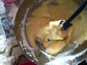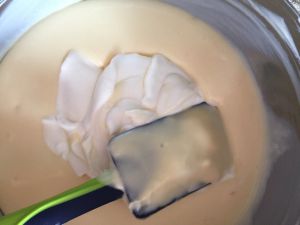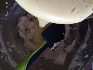 将鸡蛋糊的一半倒在马斯卡彭芝士芝士里用翻拌的手法搅拌