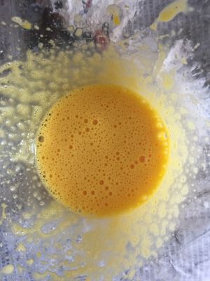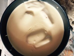 加热到80度以上就可以把之前泡好吉利丁放进去搅匀就可以了!然后放至冷凉到30度-35度!