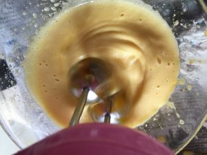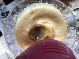用手动打蛋器把鸡蛋黄打到顺滑然后发白的程度