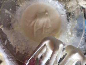 用打蛋器边打边把沸腾的糖水倒进去,糖水的凝固点是38度所以一直要继续打直到器皿温度下降,冷却到室温