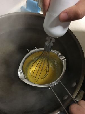蛋黄和糖混合,隔热搅拌至蛋黄稍发白,需用小火