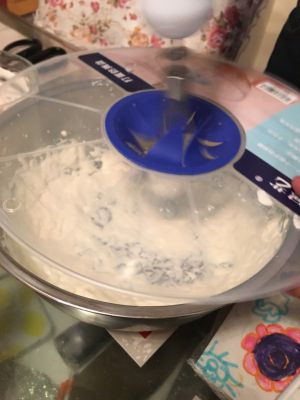 现在把吉利丁用凉水泡着!备用~ 然后把淡奶油放到打奶机里打!不要打的太硬!如图就好