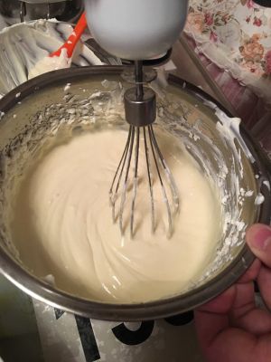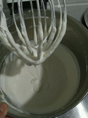 然后打淡奶油,雀巢淡奶油和打蛋头还有容器都需要提前冷藏,50克白糖分三次放,小档打至凝固状态。 具体打发方法:主页第一个菜谱,没有经验的小伙伴可以去看看~