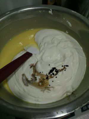 凉了后就把之前打好的淡奶油和咖啡精加进去!(咖啡精可以用速溶咖啡加点水调出来 要 记住咖啡粉可以多点水要少!这样咖啡味会重一点)搅匀就可以入模了!
