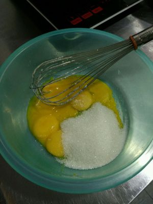 一个蛋黄,香草荚取籽,60克糖在一起搅匀,在电磁炉上隔水加热至稠