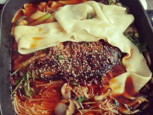 用煎鱼的底油炒肥肉片至透明,炸香姜丝,入郫县豆掰,豆瓣酱,火锅底料,炒出红油后,入辣椒,花椒面,孜然面,蒜瓣。倒入一瓶啤酒。用生抽,糖和醋调味。煮好的酱汁浇到盘子上。入230°预热好的烤箱,烤20~25°