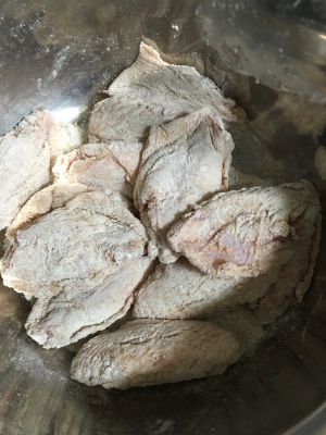 拿个大点的容器把炸鸡粉拌入,小的容器粉容易洒到外面,拌匀,让每个地方都裹上粉,腌制一会,20分钟左右吧