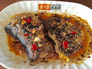抹上调好的酱料在鱼身上,再放进微波炉烤一分钟,又翻面烤一分钟,重复3次,端出来