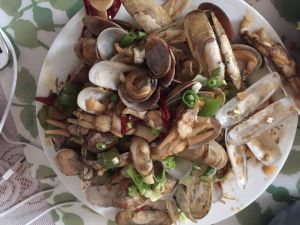 焯好的蛏子花蛤捞出来备用,此时干锅倒上油放入辣椒蒜片姜末青椒红椒等爆炒,炒的有香味时把蛏子们倒入锅中翻炒,倒入酱油稍许料酒,翻炒一下出锅前撒点盐和葱末即可出锅!