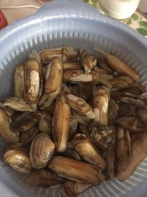 把蛏子花蛤放入清水里撒少许盐涂泥沙,大约泡2、3个小时。