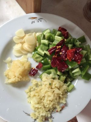 吐泥沙的过程中,将姜切成姜末大蒜切成蒜片,辣椒切成丁,如图所示