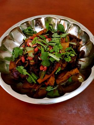 热锅倒油(平时炒菜的量就够了),待油至五分热小火加入花椒炒出香味,再加入大蒜、生姜片、豆瓣酱、辣椒炒出香味; 倒入沥干水分的菜中火翻炒,出锅后撒上熟白芝麻、香菜点缀即可,色香味俱全