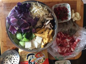 将所有的菜洗净整理好备用,锅中加水,水开放土豆、莲藕、西兰花 并加入少许盐焯水(大概五分钟,不要煮太久,煮太久怕煮软了,看个人口味吧);依次将肉丸、菇类全部焯水盛出过凉水沥干水分