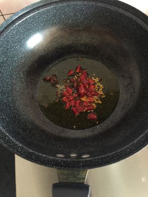 炒锅放食用油,放入花椒,大料,红辣椒,小火熬制花椒油