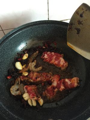 将炒黄的排骨与鸭翅、大虾放入翻炒