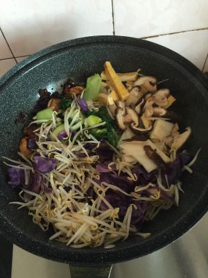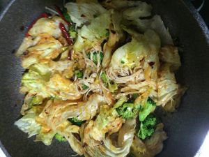 加入青菜,继续翻炒,加白糖,盐,酱油,鸡精调味