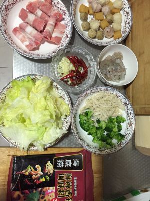 大虾去虾线去皮留虾仁装盘备用(也可以直接用大虾,个人觉得还是去虾线卫生又美味!)西兰花,金针菇洗完用开水焯2分钟左右,控水晾干装盘备用!包生菜洗好撕成小片装盘备用!鱼丸等丸子也是开水焯3分钟左右控水备用!切好的葱花,干辣椒,蒜末,姜片放在一个小碗里备用!