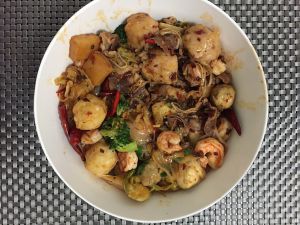 1.木耳提前用凉水泡发好,去掉根部备用;2.洋白菜、生菜撕成片备用;3.虾和培根分别用少许油煸熟,培根变色即可。虾可以小火多炒会儿至虾皮酥脆!4.洋葱、胡萝卜切片备用;5.山药、菜花、芹菜、土豆处理好,分别用热水焯一下,七八成熟即可,木耳也用热水焯一下,捞出后用凉水泡一下,再控干水分备用;6.热锅凉油,油多一点点,放入郫县豆瓣酱、火锅底料,小火炒香,放入麻椒、草果、肉蔻、葱姜蒜,继续煸炒出红油,一次放入木耳、虾、培根炒匀;7.放入洋葱、胡萝卜炒匀;8.放入菜花、土豆、芹菜、洋白菜炒匀;9.最后放入小米辣椒和生菜炒匀;10.用盐调味即可!
