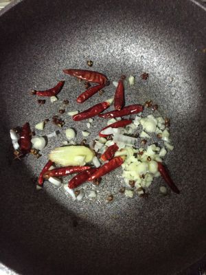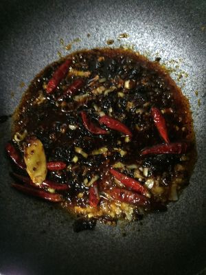 将辣椒节和大蒜、姜片、花椒粒煸出香味,在放两勺郫县豆瓣酱煸出香味。