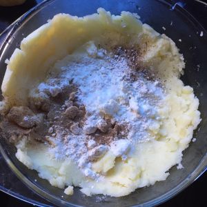 然后把火腿丁、胡萝卜丁、葱花放入土豆泥里,再放2勺面粉