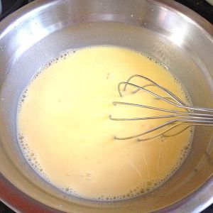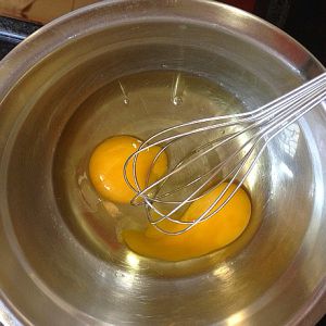 两枚鸡蛋磕入碗中,用打蛋器搅匀。不用打发,只要尽量慢慢地搅拌均匀就行了。