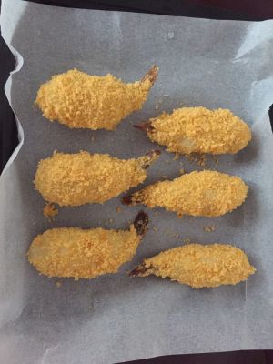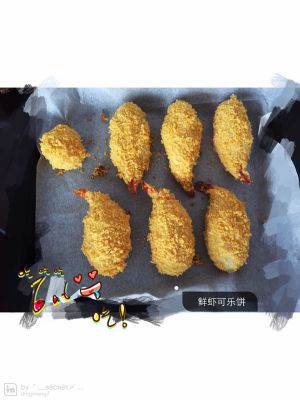 将完成的土豆泥,分成6份,每份搓成椭圆形,然后在中间按压下去将虾放进去,裹起来,捏紧,放入蛋液里滚一下,再放入面包糠里粘上面包糠