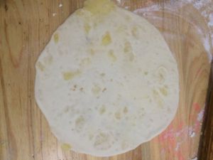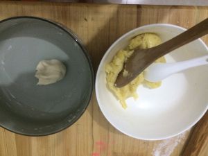 把调好的土豆泥,揉搓成小丸子状,然后压扁。