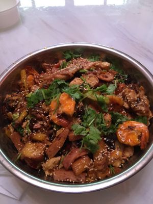放入灯笼椒继续翻炒,大概翻炒15分钟后装盘撒上白芝麻和花生米,放上香菜Ok。