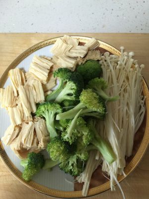 趁着泡发腐竹的时间,将蔬菜都切好备用。