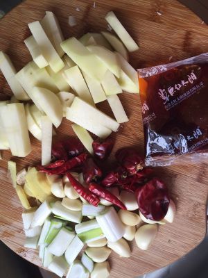 葱、姜、蒜,切片,备好小米椒和灯笼椒,土豆切条,备好麻辣香锅料一小袋待用。