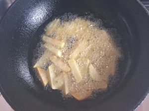 锅中放油,油热后把土豆条放进去炸成金黄色捞出。