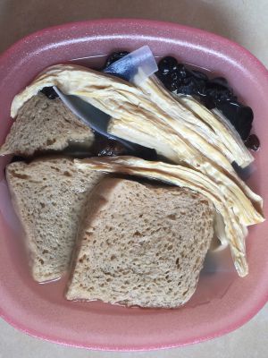 腐竹、木耳、干面筋、粉皮,用温水泡软。