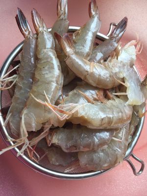 大虾去头,背部开刀挑去泥线备用。