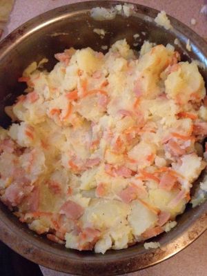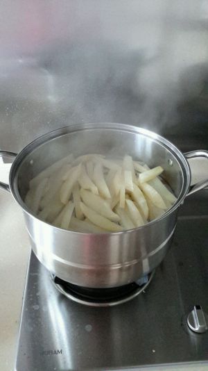 土豆放鍋里蒸熟 胡蘿蔔切絲 一定要是絲