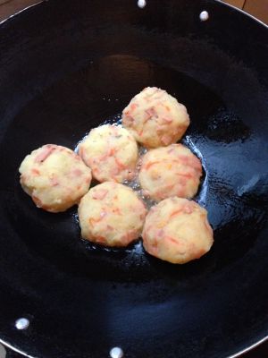 调制好后,搓团压制一厘米厚度入油锅小火煎炸!