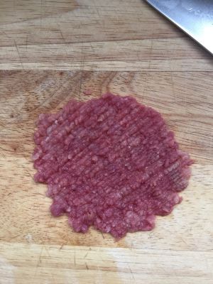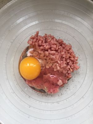 鸡蛋,肉泥,火腿,和匀,放适量酱油,料酒,耗油。
