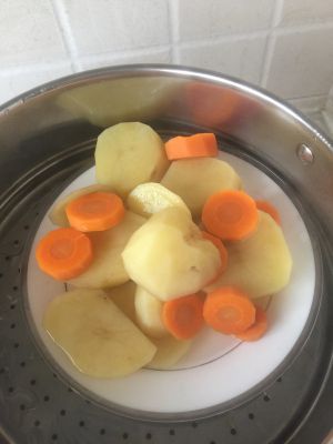 里脊肉切末,火腿切小丁,胡萝卜土豆蒸熟。