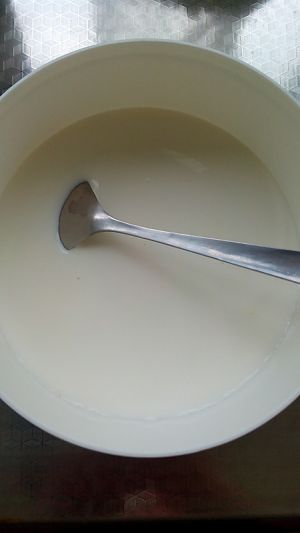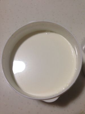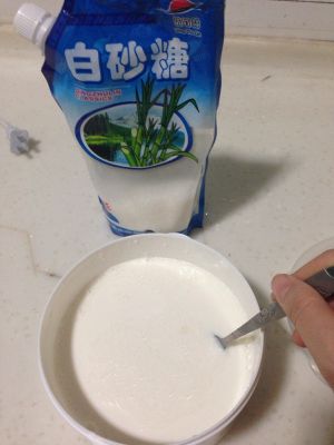 再把牛奶倒入。充分搅拌,让糖融掉,再放进面包机内,按酸奶制作即可。