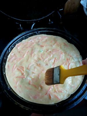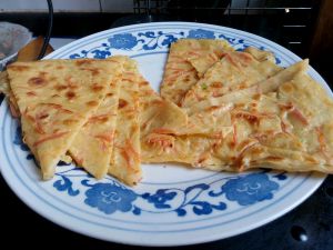 大约两分钟左右,平底锅拿起来晃动几下,让饼可以晃动。底面金黄色之后可以翻面继续。(翻面是个技术活,我第一次做两张之后才翻出完整的。多实验一定成功)