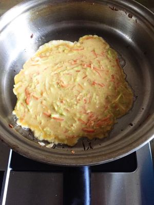 西葫芦鸡蛋液充分搅拌,根据个人口味,我放的盐,蚝油,最后加面粉。锅里放少许油,均匀摊平