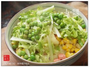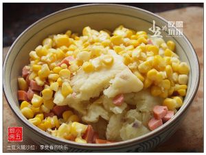 混合热油和蛋黄,加入土豆泥,玉米粒,火腿粒,胡萝卜粒,加入调料和沙拉酱,抓匀就好了,沙拉酱可以多点。