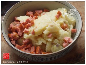 土豆、胡萝卜切丁蒸熟后倒入火腿丁压匀。