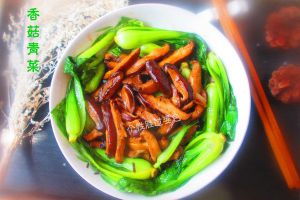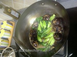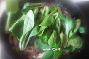 香菇差不多熟的时候,将青菜倒入,一起煮