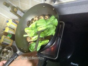 待水收干,最后放入青菜,翻炒少许,放入适量盐,,大功告成!