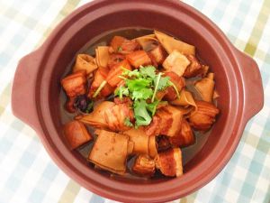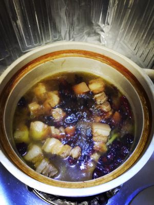 7、大火烧开后,改小火慢炖60分钟,加入东北干豆腐(这个可加可不加,依个人喜好而定)。继续小火30分钟后,加入盐适量、冰糖适量(3块左右就可),继续小火10分钟,完成。