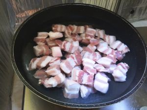 去一块方方正正的猪五花 皮朝下先煎至金黄 在把四面煎出肥油