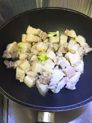 6、大勺内放入少许油,把葱、大料,也可加一个干川椒,煸炒出香味放入五花肉继续煸炒。再加入海鲜酱油、红烧酱油煸炒五分钟后,倒入砂锅备好的水中。